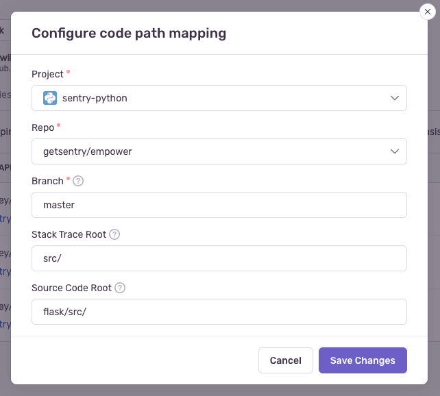• Repo (required): This is the Bitbucket project associated with the Sentry project above. If you have more than one Bitbucket project being used per Sentry project, you'll need multiple code mappings.